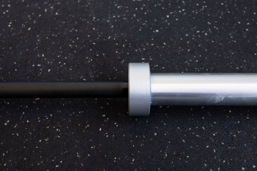 European designed with standard spacing between sleeves to allow for racking on standard racks and proper grip positions, 25mm dia aluminum shaft rated to 42k tensile strength, textured black powder coating finish, medium grip knurling with IWF knurl marks (no center knurling or powerlifting marks), and composite bushings with snap-ring sleeve assembly.