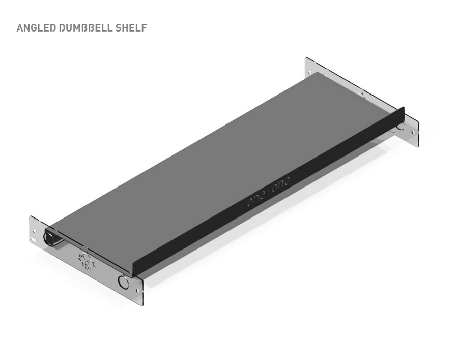 Utilizing the secondary mounting holes to angle the rail shelf - place the 15'' dumbbell shelf on the rail shelf for a fastener free secure fit with a dumbbell return lip for safety.