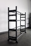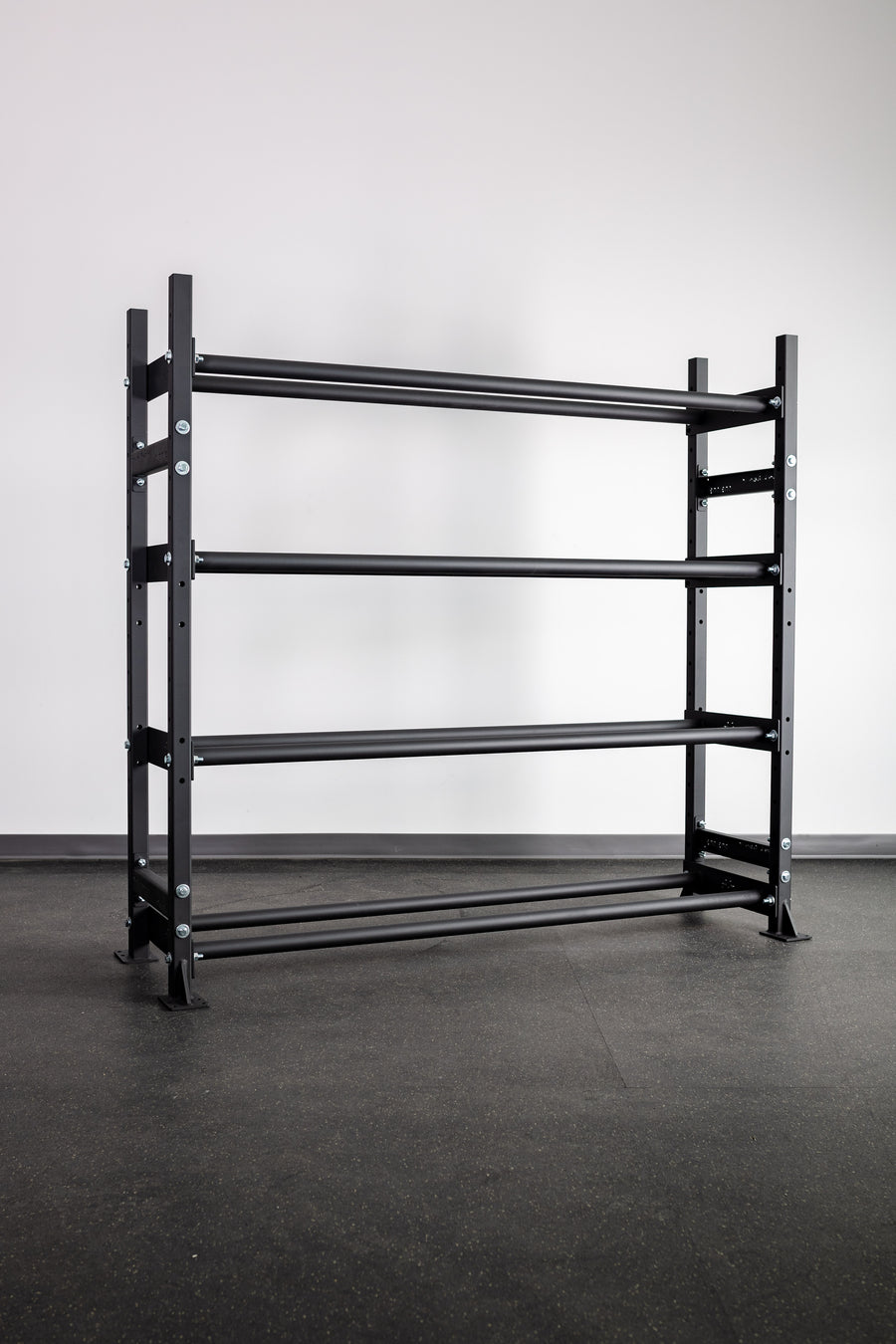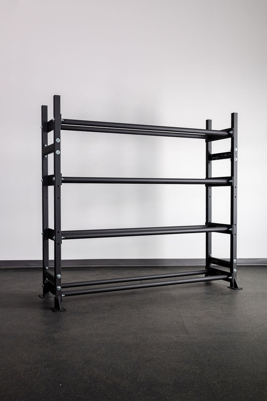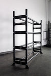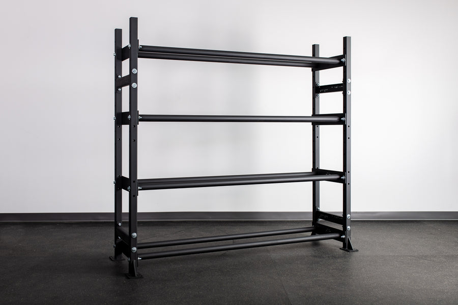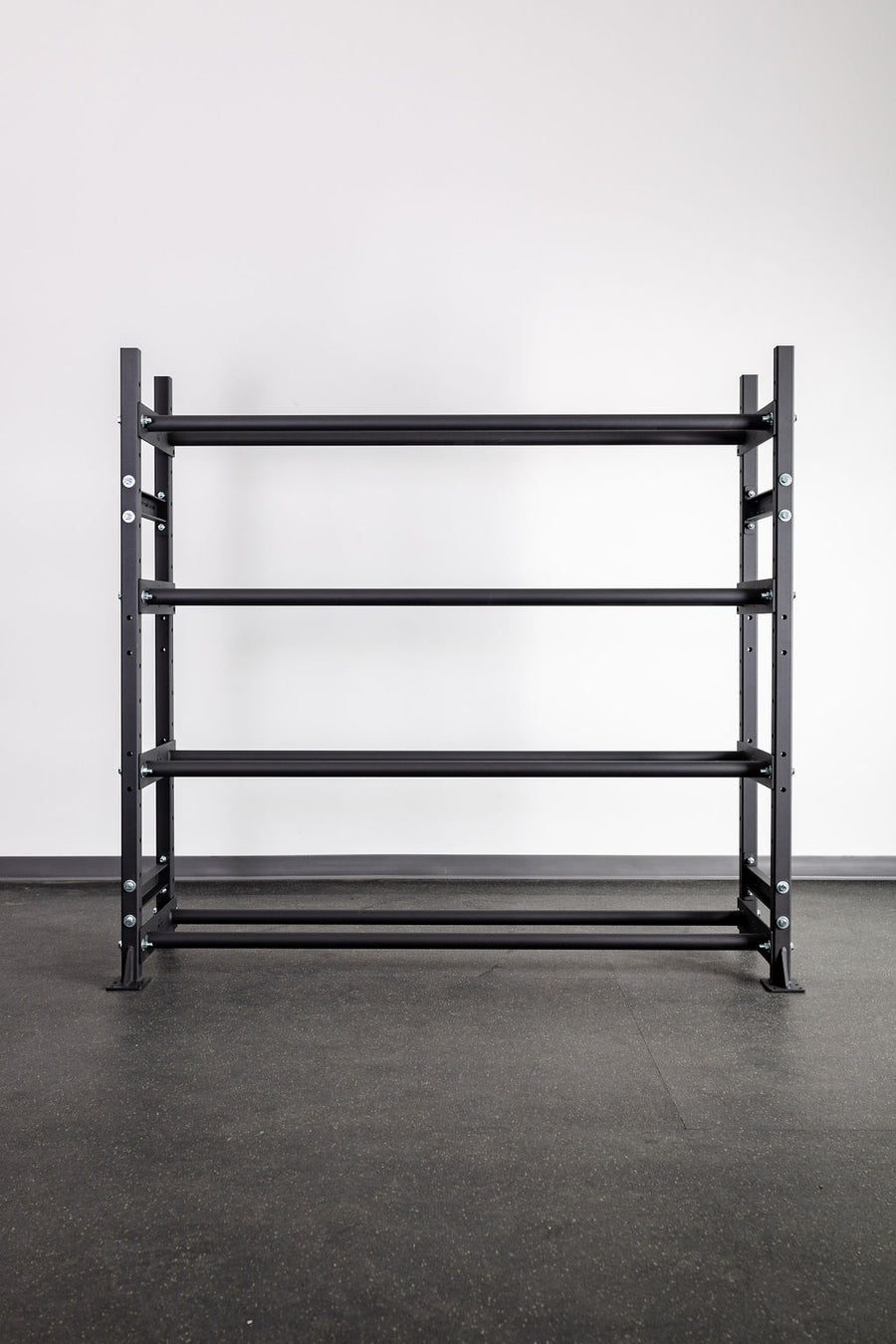 Our 4 Tier Shelf includes (4) rail shelves and is available in 4' or 6' lengths. Our rail-style storage design is the perfect option for storage of plates, med-balls, and gym mats.