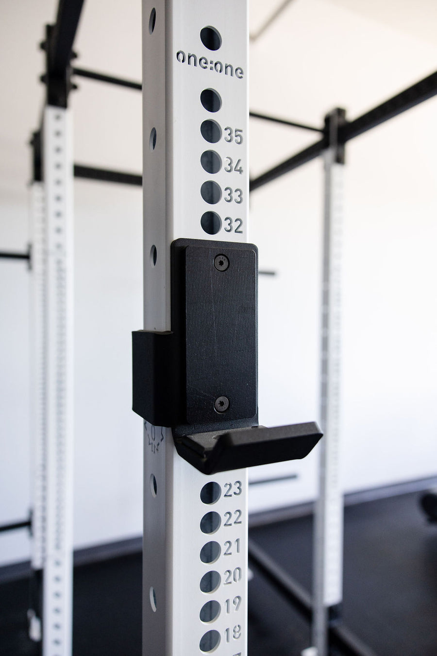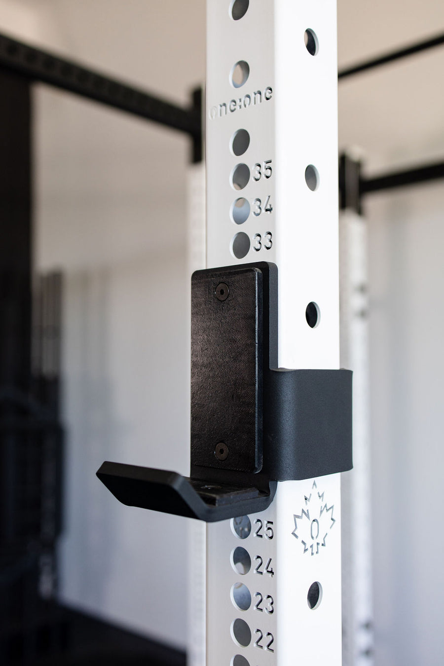 One:One's J-Hook is laser cut and formed with Canadian steel for durability and strength. Each Pair of J-Hooks is rated for over 700+lbs, and is lined with UHMW plastic on the face and bottom to protect the knurling on your bar.