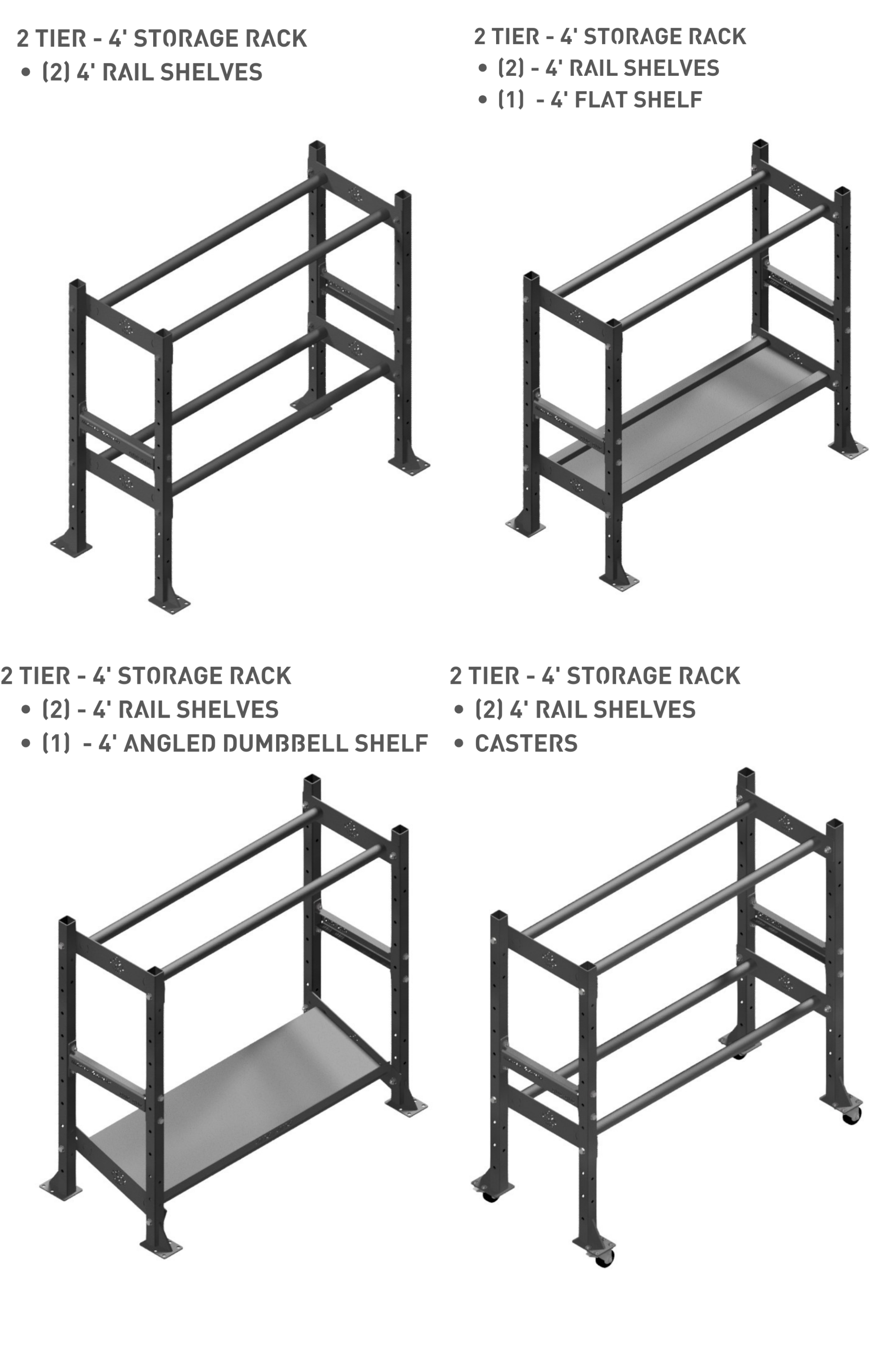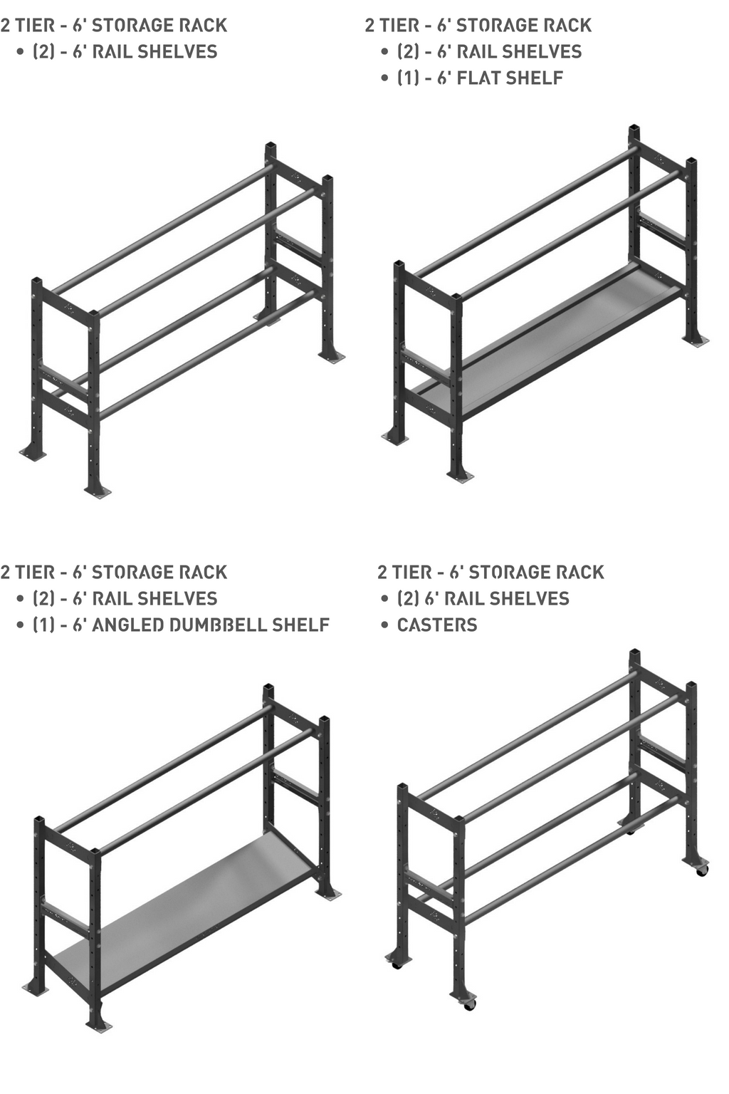 Coupled with our flat or angled 10ga steel shelves which are perfect for kettlebells or dumbbells will not only be protected from damage but will remain in place due to our unique tray design.