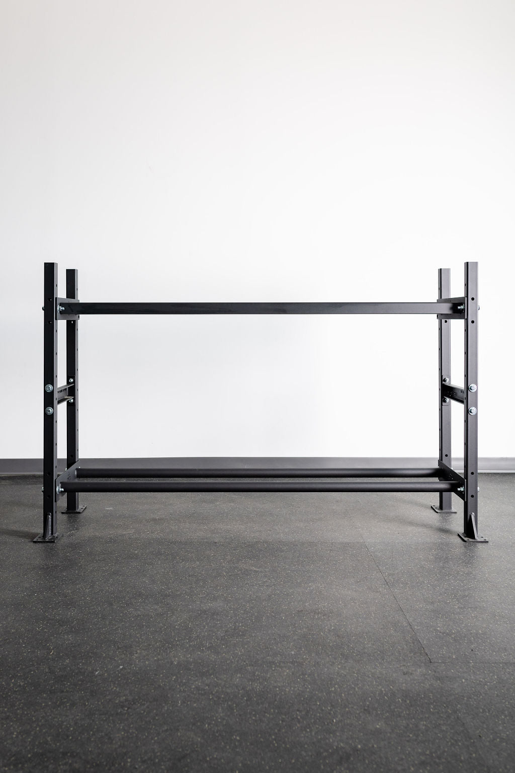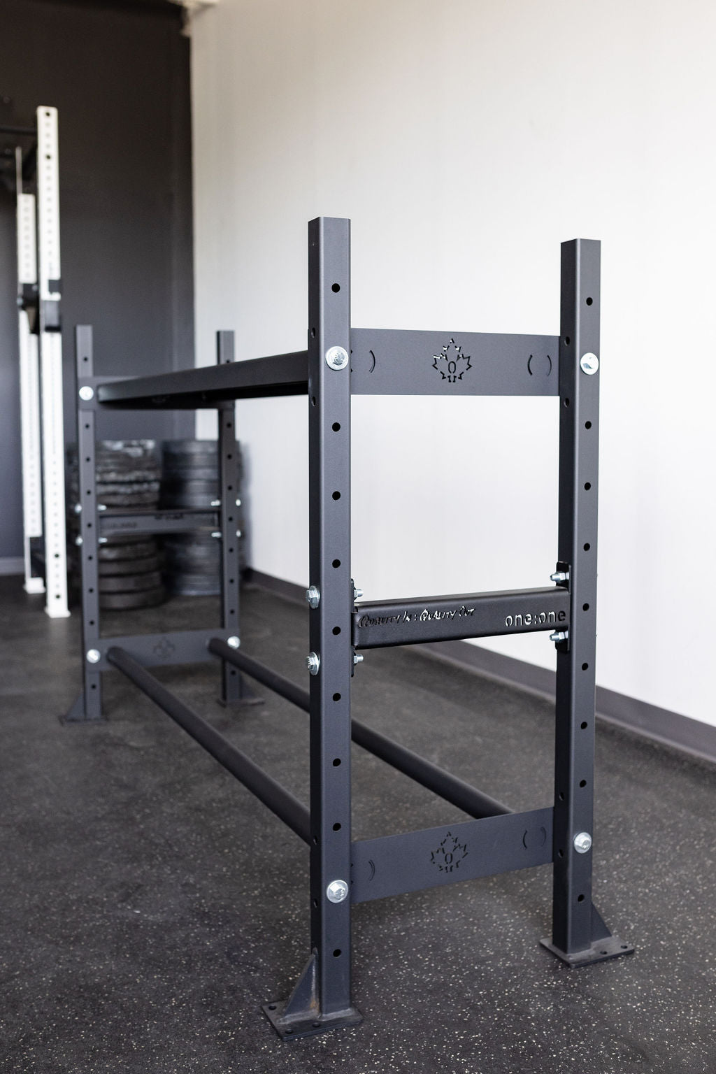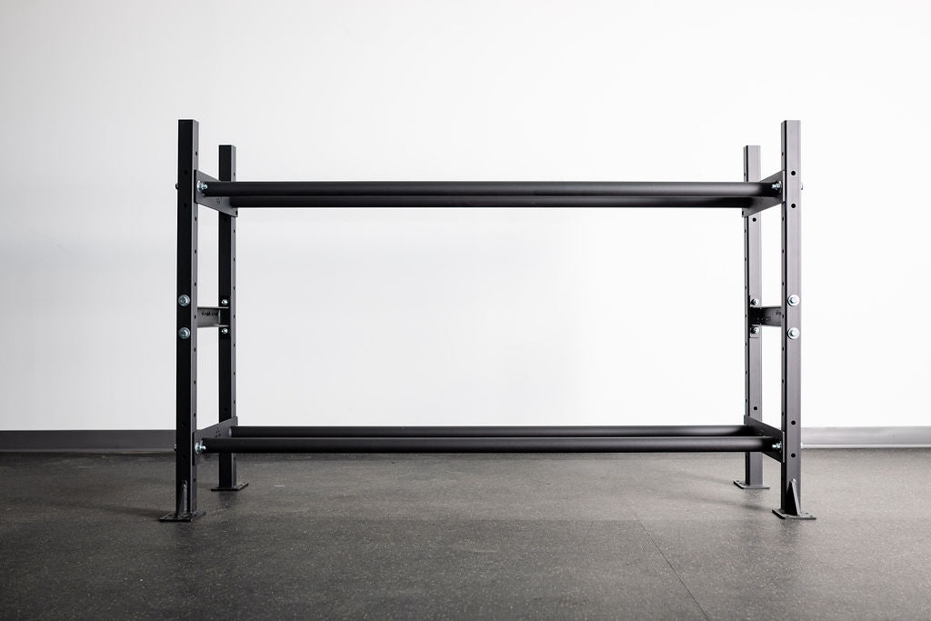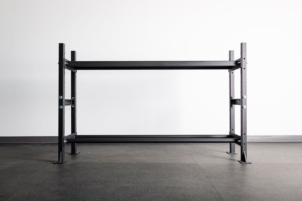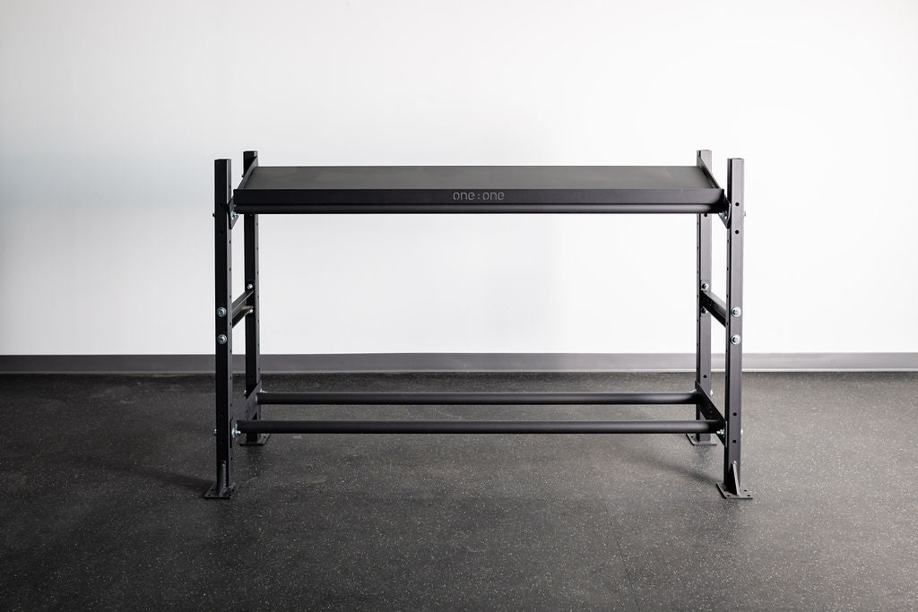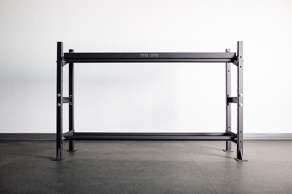 The One:One Storage Shelf allows you to increase your floor space by organizing your workout gear on a versatile, tiered storage shelf system. Our 4' Shelf includes (2) rail shelves and is available in 4' or 6' lengths. Our rail-style storage design is the perfect option for storage of plates, med-balls, and gym mats.