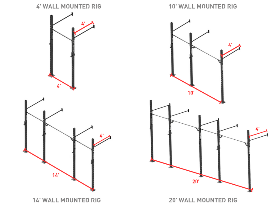 Each rig alternates between 4' Squat sections and 6’ pull-up bar sections for sufficient spacing to load/unload the barbell. Wallmounted rigs come with standard 42'' width pull up bars off the wall.